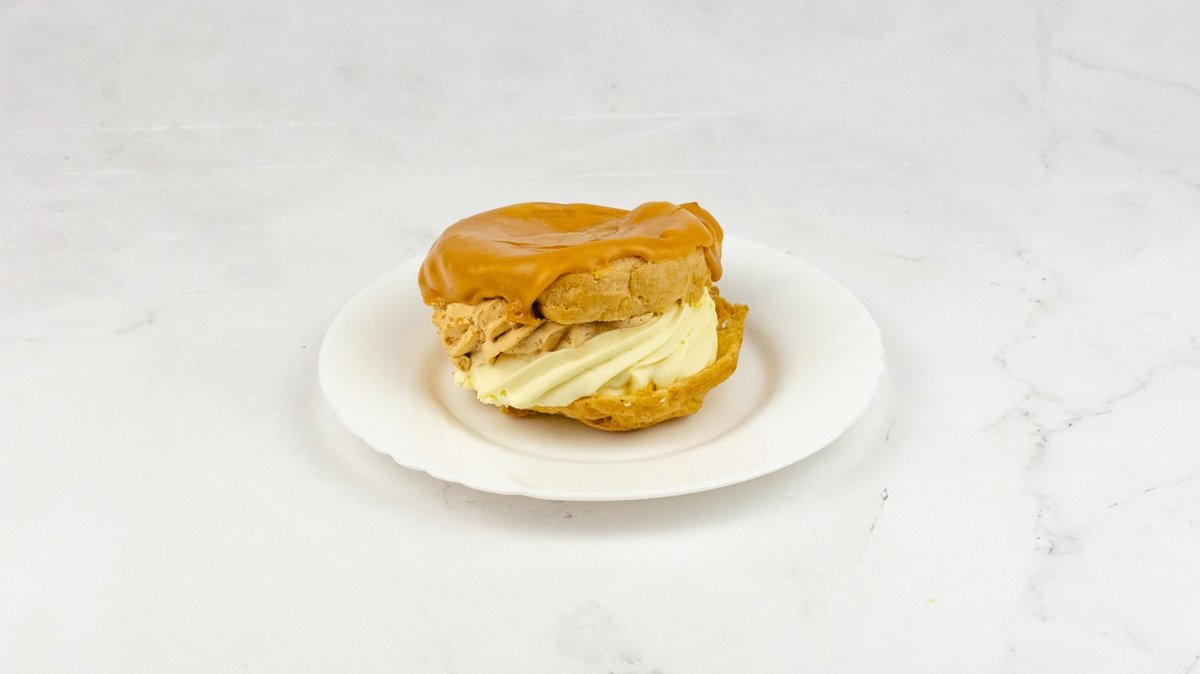 Upečená křupavá rulička z ručně vyrobeného listového těsta z farmářského másla a plněná nadýchaným krémemem se slaným karamelem a posypaná křupavými karamelovými sušenkami