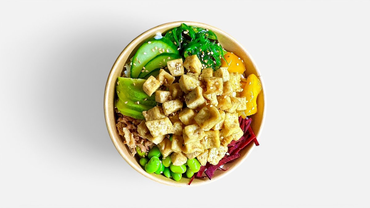 Smažené tofu, sushi rýže, edamame, wakame, okurka, mango, řepa, japonská majonéza, avokádo, smažená cibule, sezam, originál Hawaii omáčka