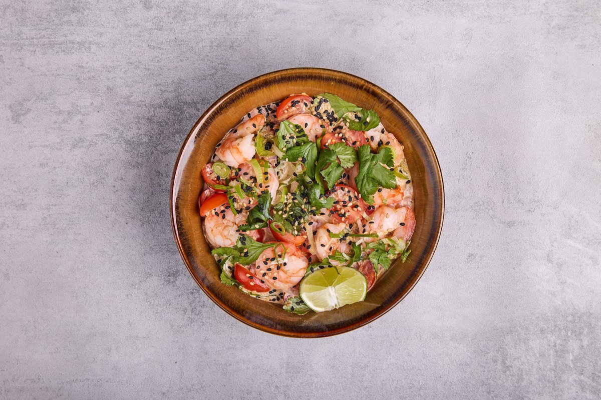 Krevetová či kuřecí thajská polévka. Středně pálivá. Podávaná s cherry rajčátky, koriandrem, jarní cibulkou, sezamem a limetkou