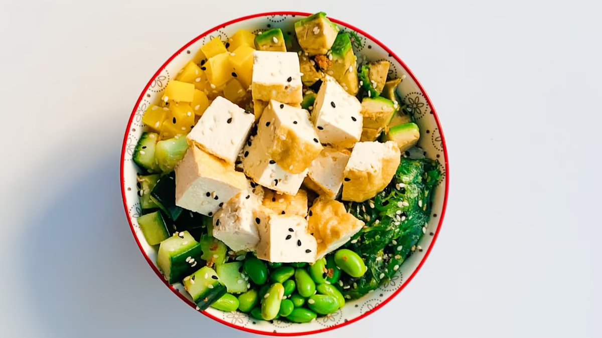 tofu, edamame, avokádo, okurka, mango, ředkev, wakame, teriyaki, majonéza, sezam, mořské řasy