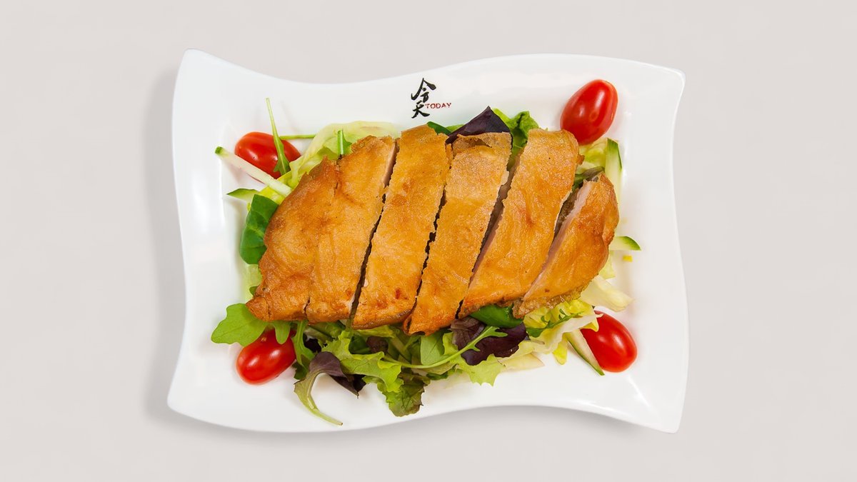 B7. Kuřecí kousky, hranolky, pikantní polévka, salát