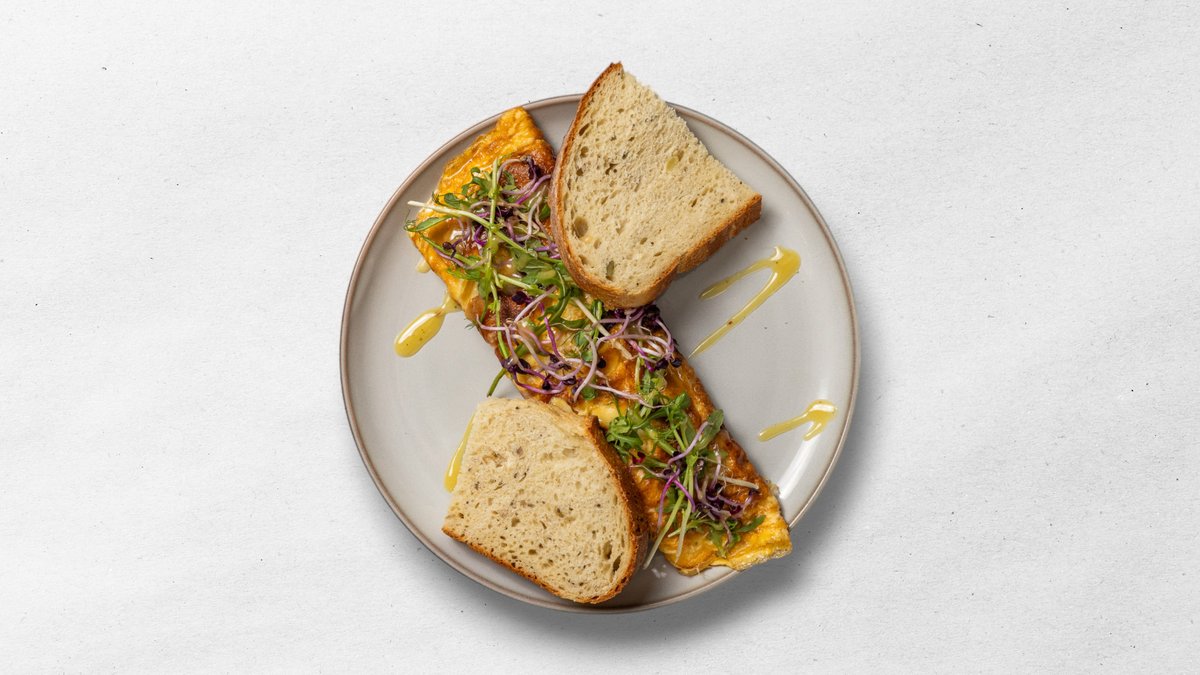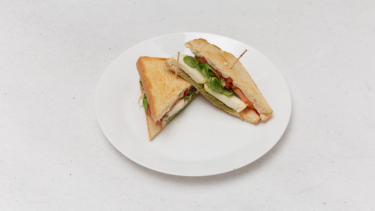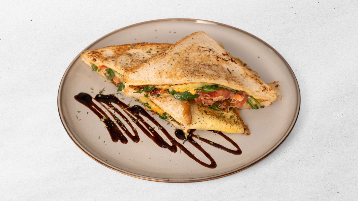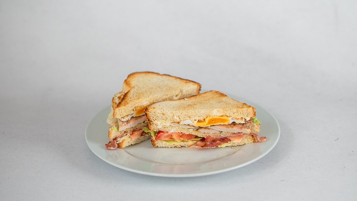 opečený toast na grilu 3ks, kuřecí maso, vejce, slanina, majonéza, ledový salát, rajče, červená cibulka