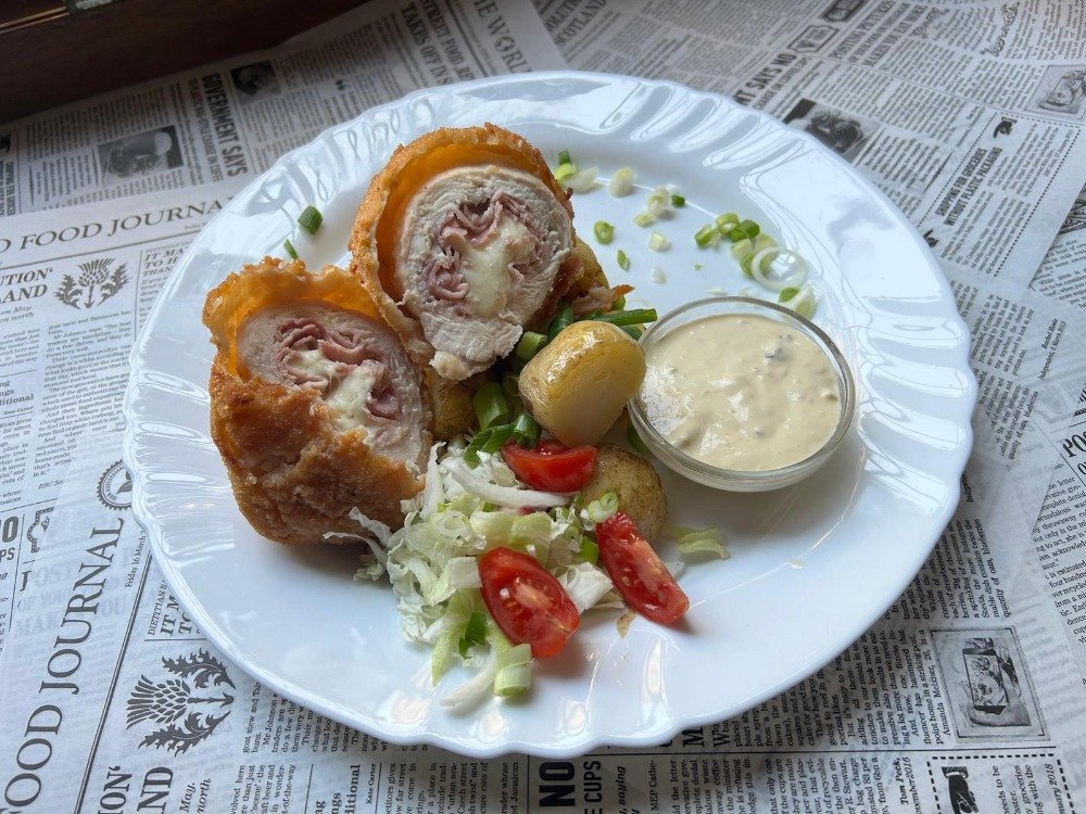 Smažené kuřecí prso plněné pražskou šunkou od kosti a sýrem, zámecké brambory, naše tatarská omáčka.