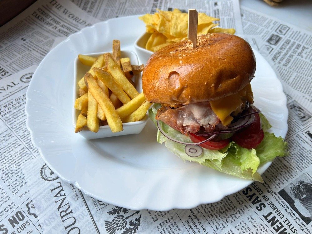 Hovězí maso, dvojitá slanina, cheddar, rajče, ledový salát, majonéza, nakládané okurky, červená cibule, farmářské hranolky, nachos.