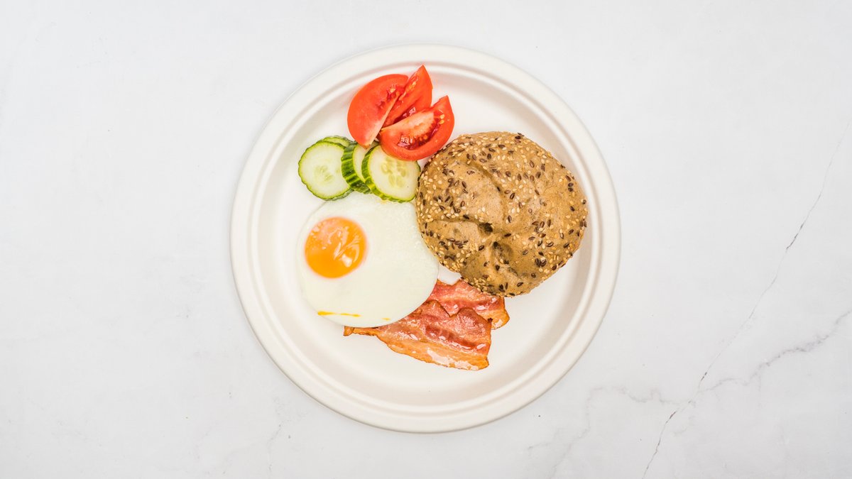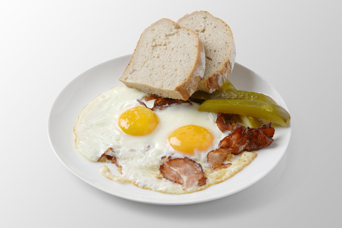 opečená slanina, bavorská klobáska, volské oko, fazole v tomatové omáčce, žampiony