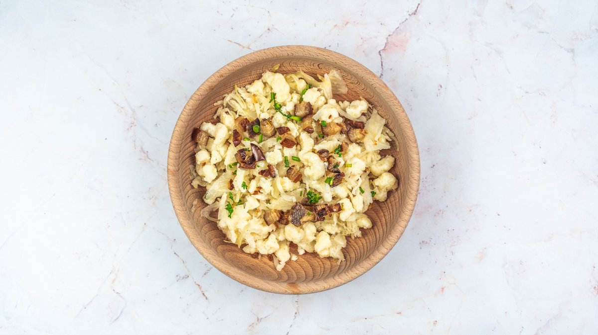 Halušky se zelím a trhaným kachním masem, smažená cibulka