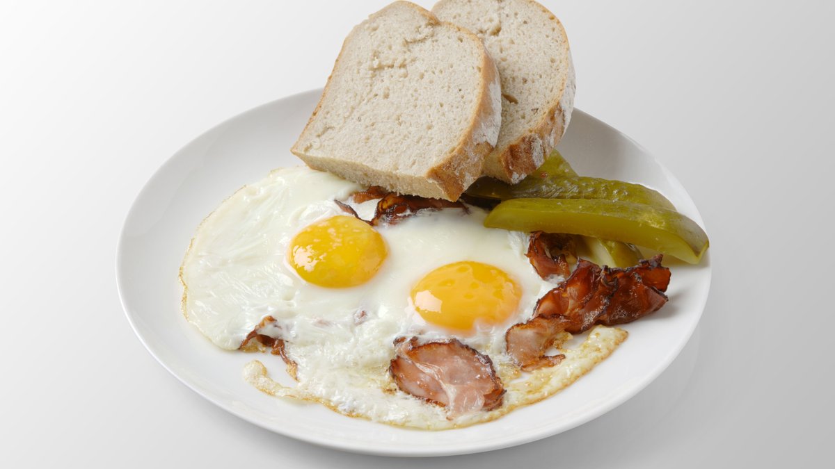 Švejková topinka vejce, slanina, rajče, cibule, volské oko 2ks