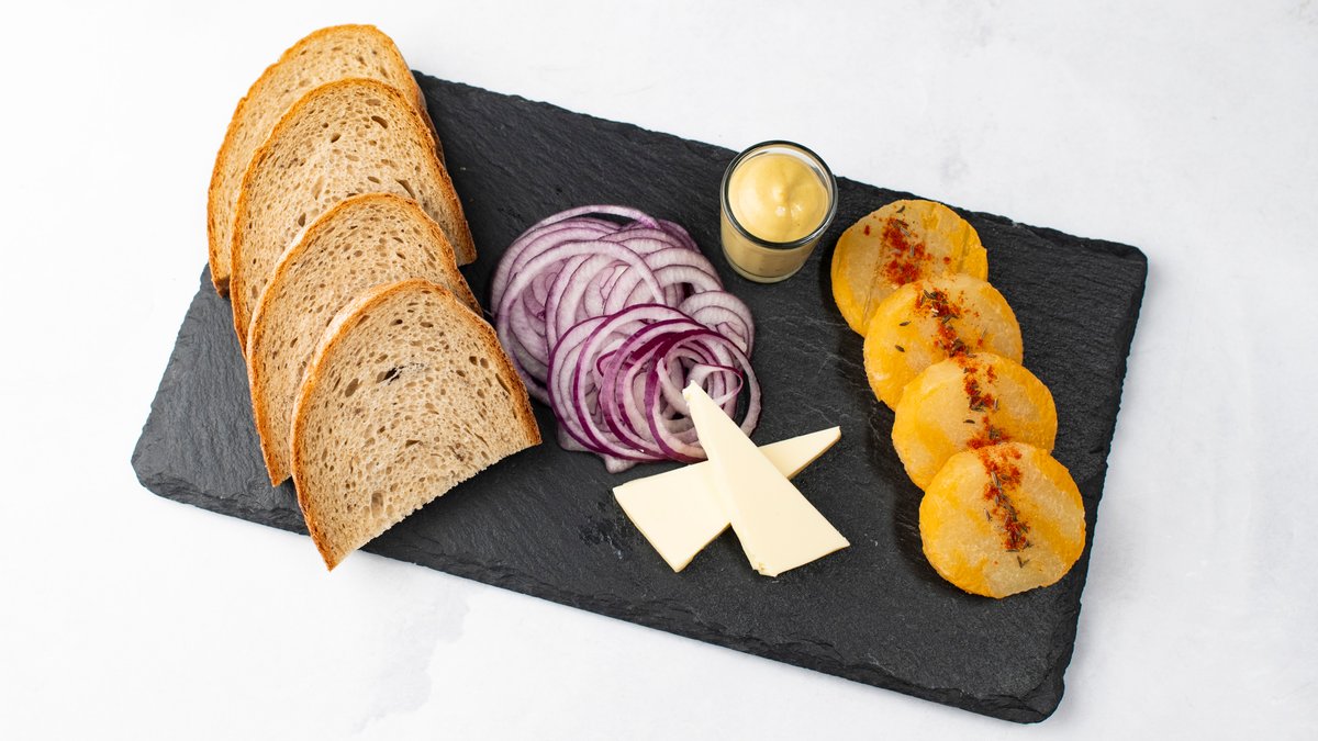 DOMÁCÍ MAJONÉZA, ZAKYSAÁ SMETANA, CHILLI, HOŘČICE, ČESNEK, CIBULKA, CITRÓN, OPEČENÉ TOASTY