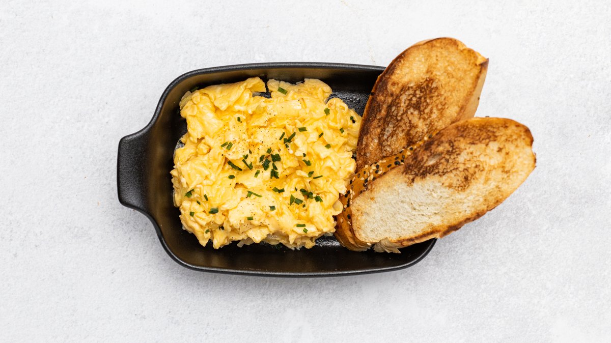 Pošírovaná vejce na smetanovo-bylinkovém jogurtu s chilli, čerstvé pečivo