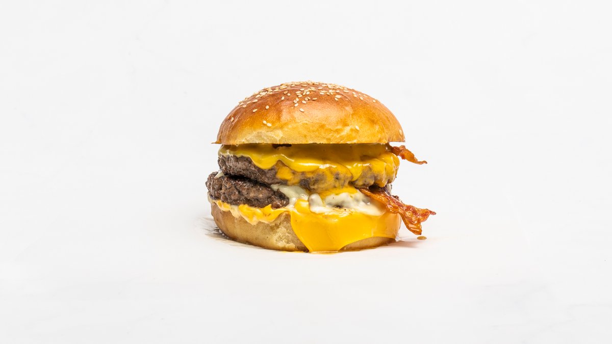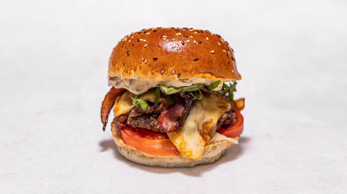 2x hovězí maso, slanina, červená cibule, domácí BBQ omáčka, jalapenos paprička, okurka, rajče, ledový salát, belgické hranolky, nachos