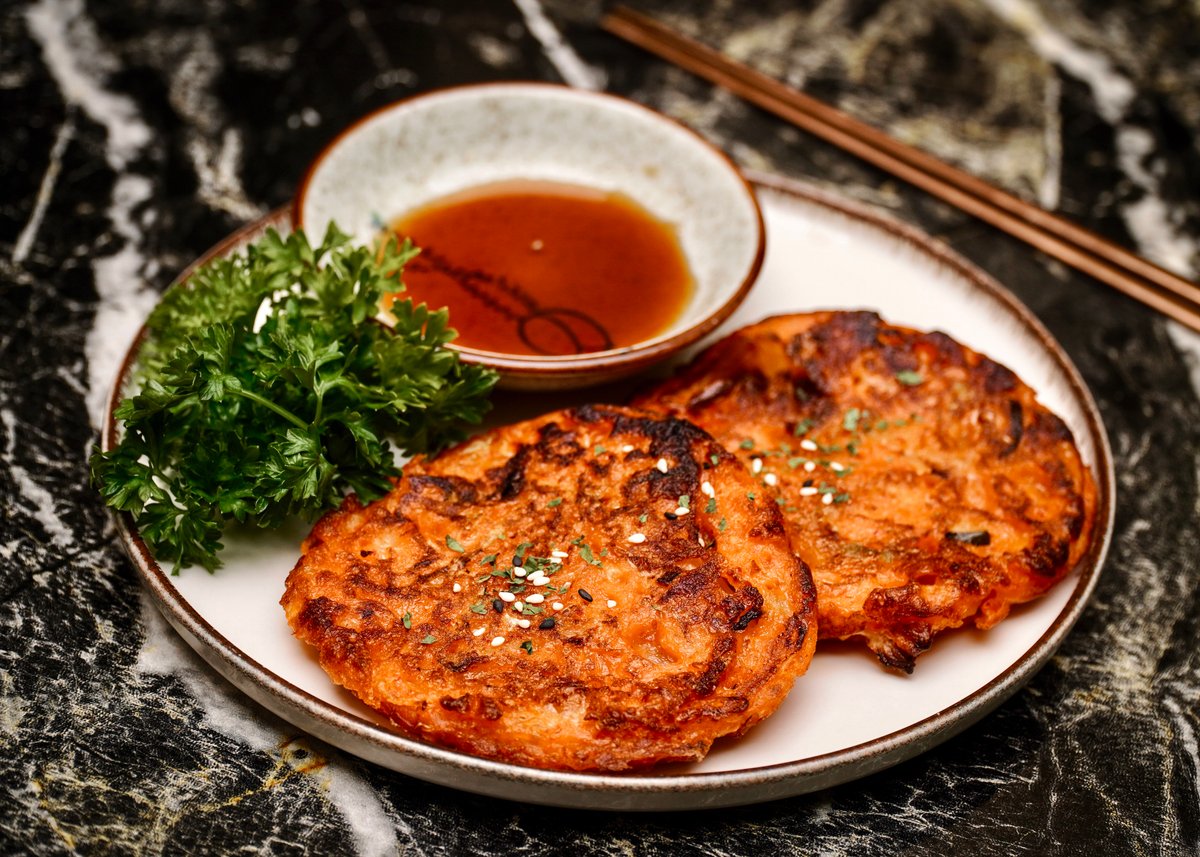 Pikantní palačinka s domácím fermentovaným kimchi s posypaným sýrem. / Savory pancake made with spicy fermented homemade kimchi, topped with cheese.