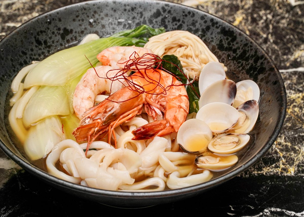 Silné nudle Udon s jemným vývarem z dashi a sójovou omáčkou, doplněné jídlem s čerstvými mořskými plody. / Thick Udon noodles with a mild broth made from dashi, soy sauce, topped with fresh seafood.