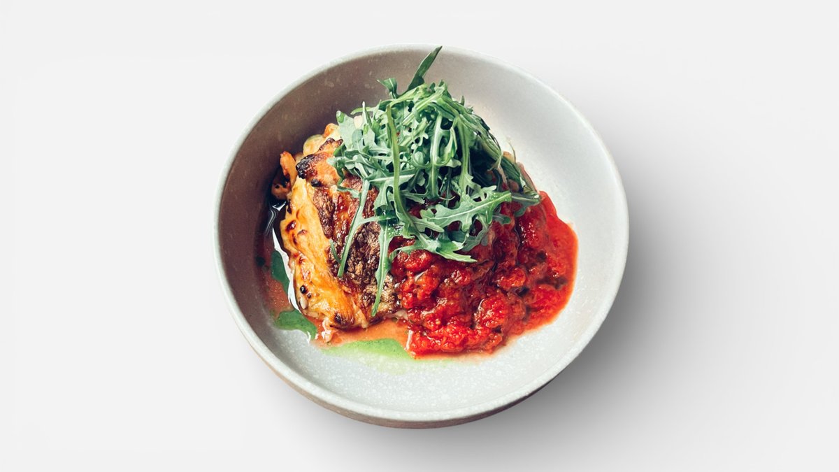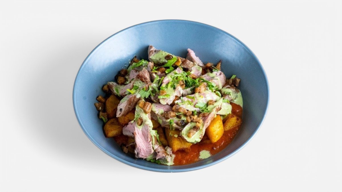 na plátky krájený steak z iberského vepře, křupavé brambory ve slupce, peperonato frito a česneková aioli