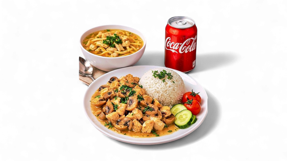 POLEDNÍ MENU: Kuřecí vývar + kuřecí směs na žampionech s rýží + jeden napoj (Coca-Cola / Fanta / Sprite)