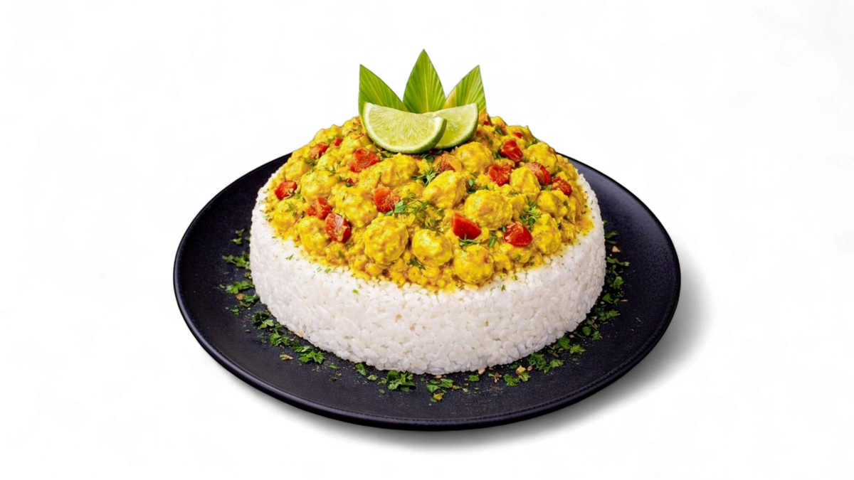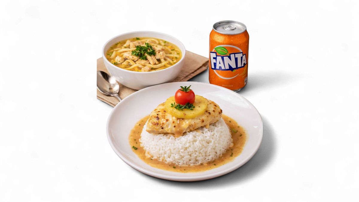 kuřecí vývar + kuřecí nudličky na kari s rýží + jeden napoj (Coca-Cola / Fanta / Sprite).