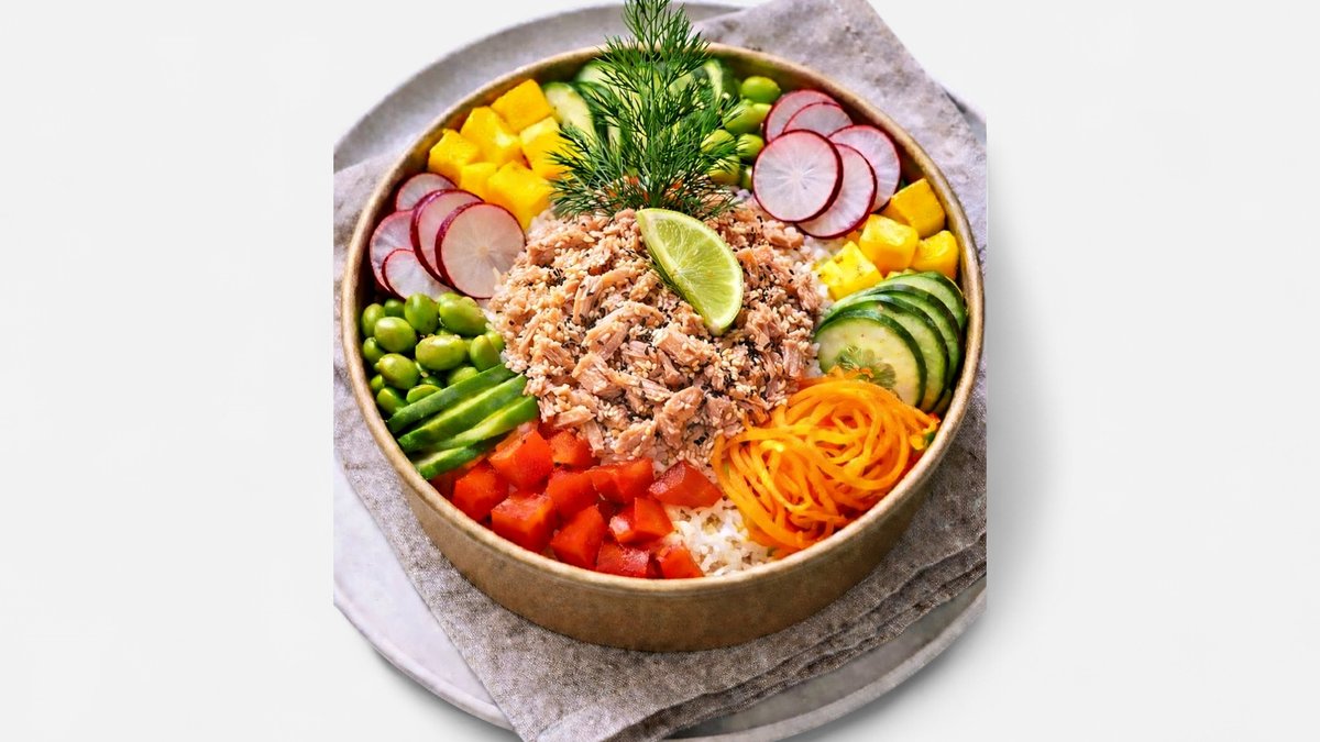 Poke: kuřecí maso, rýže, okurka, mango, ředkvička, kukuřice, mrkev, paprika, zelené boby, japonská majonéza.