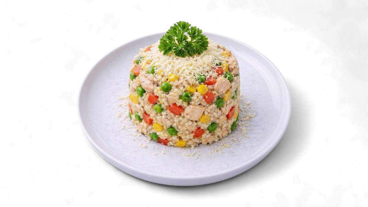Domácí zeleninové rizoto s kuřecím masem sypané sýrem.
