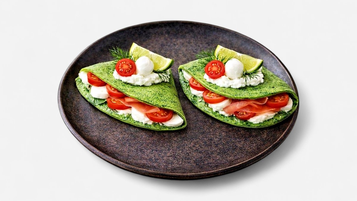 Špenátové palačinky s tvarohovo-sýrovou pomazánkou, mozzarellou a rajčetem.