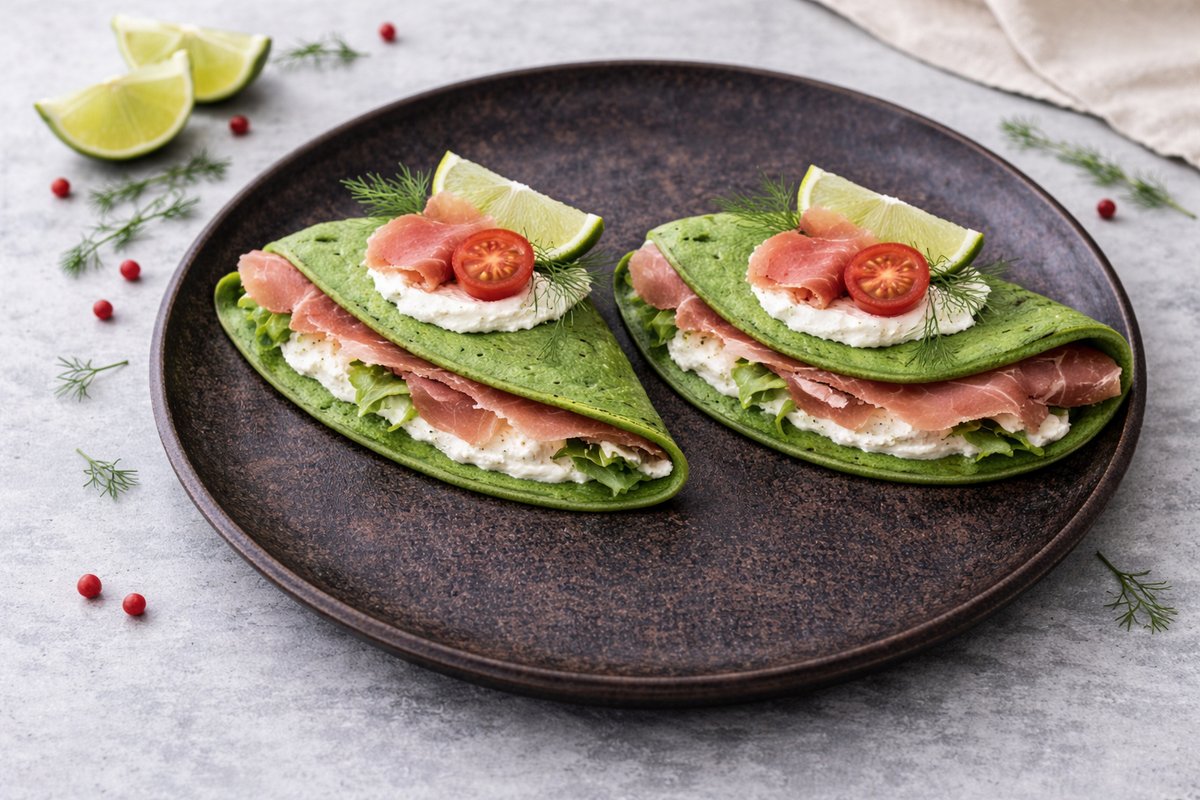 Špenátové palačinky s tvarohovo-sýrovou náplní a parmskou šunkou.