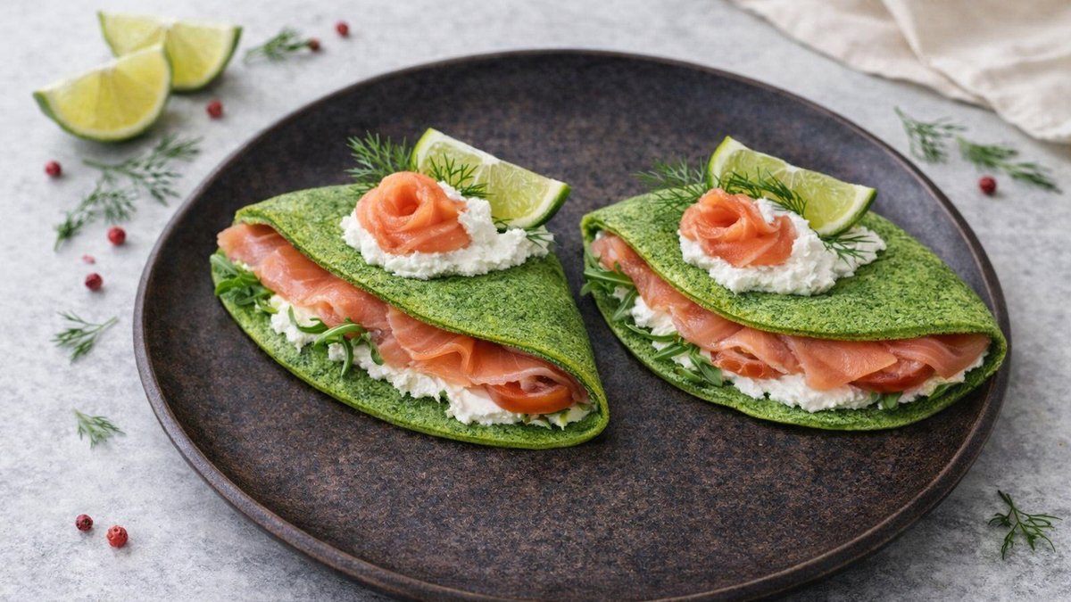 Špenátové palačinky s tvarohovo-sýrovou náplní a lososem.