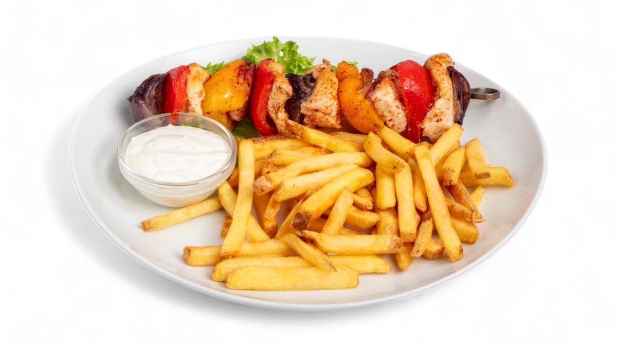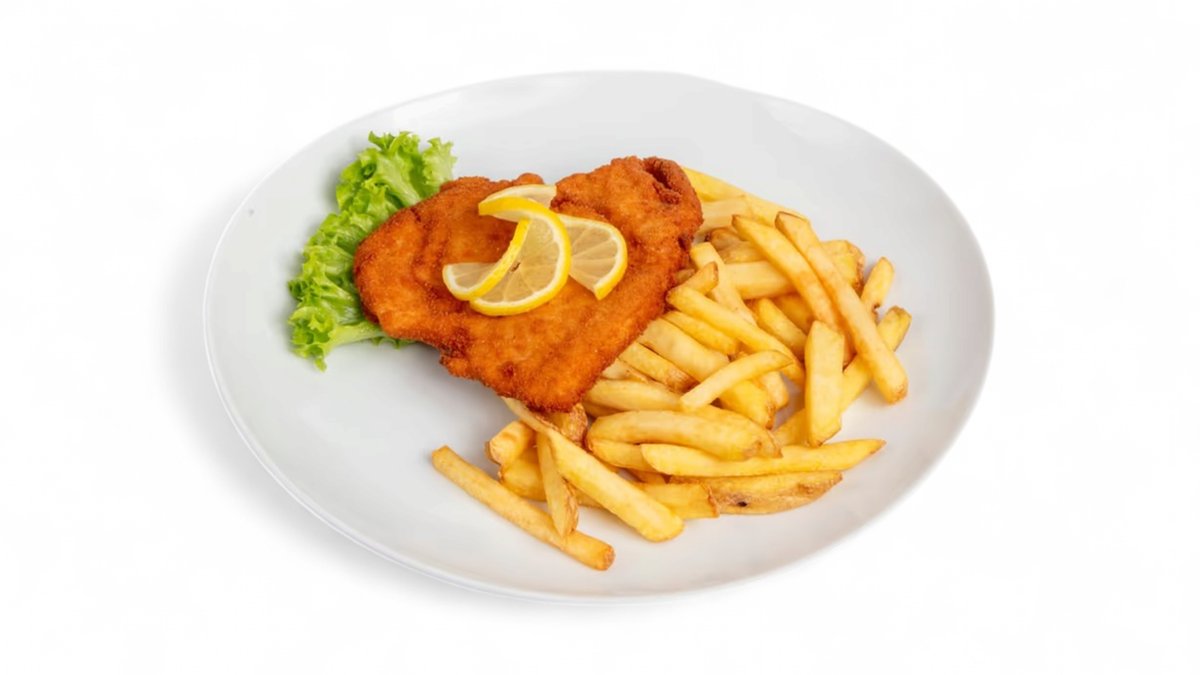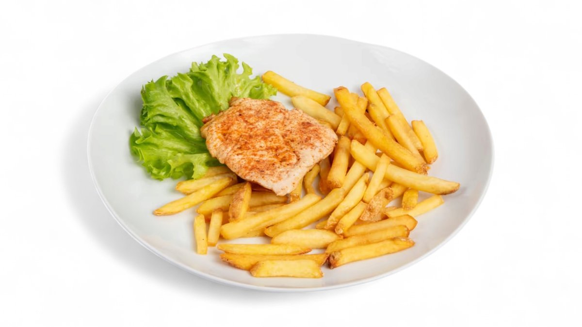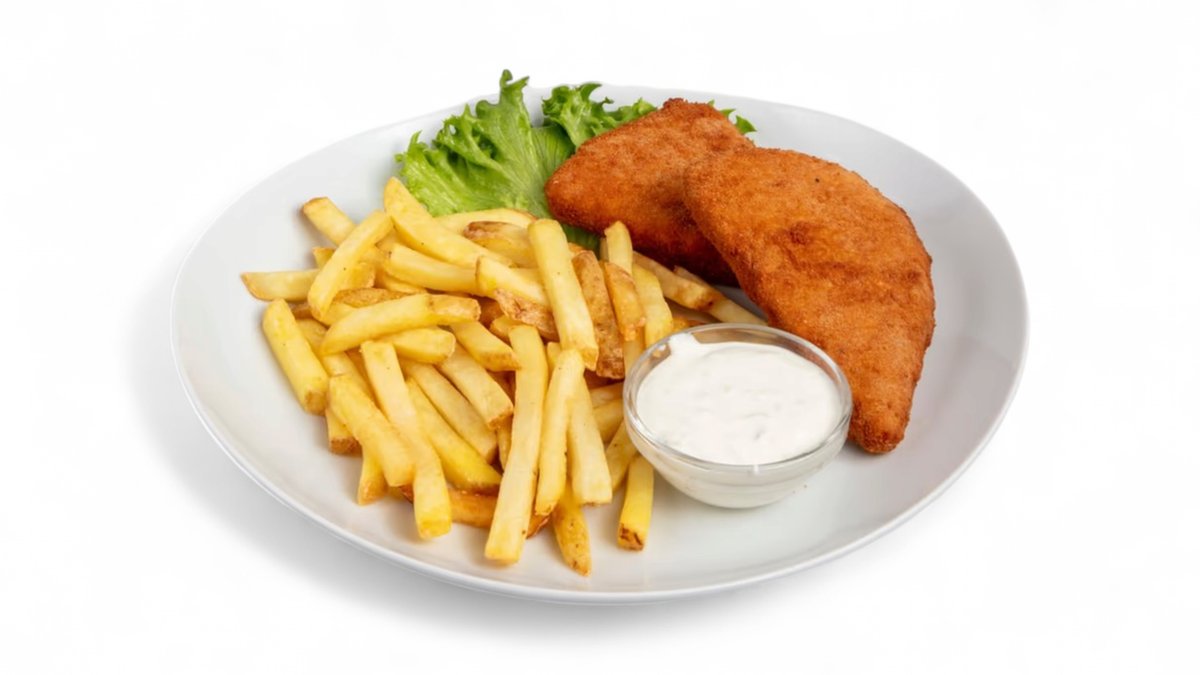 S bramborovými hranolky a naší tatarskou omáčkou.