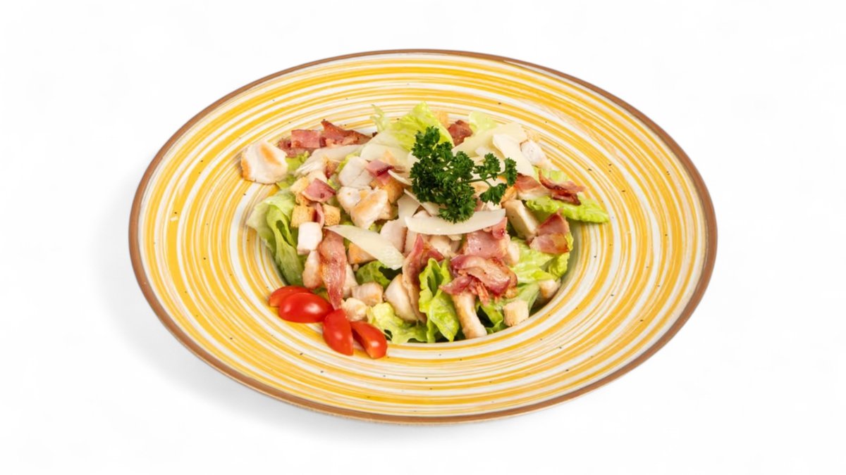 S kuřecím masem, anglickou slaninou, dresinkem a krutony.