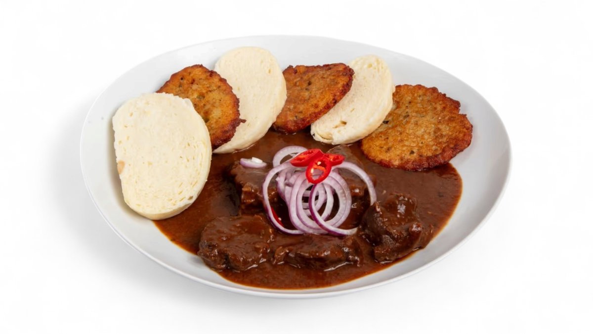 S červenou cibulkou, bramboráčky a houskovými knedlíky.