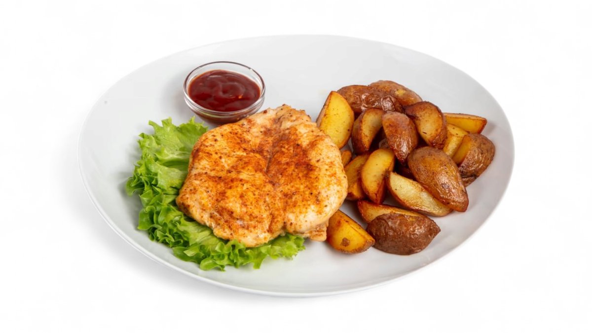 S opečenými bramborami a BBQ omáčkou.