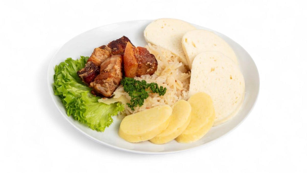 S bílým zelím, variací houskových a bramborových knedlíků.