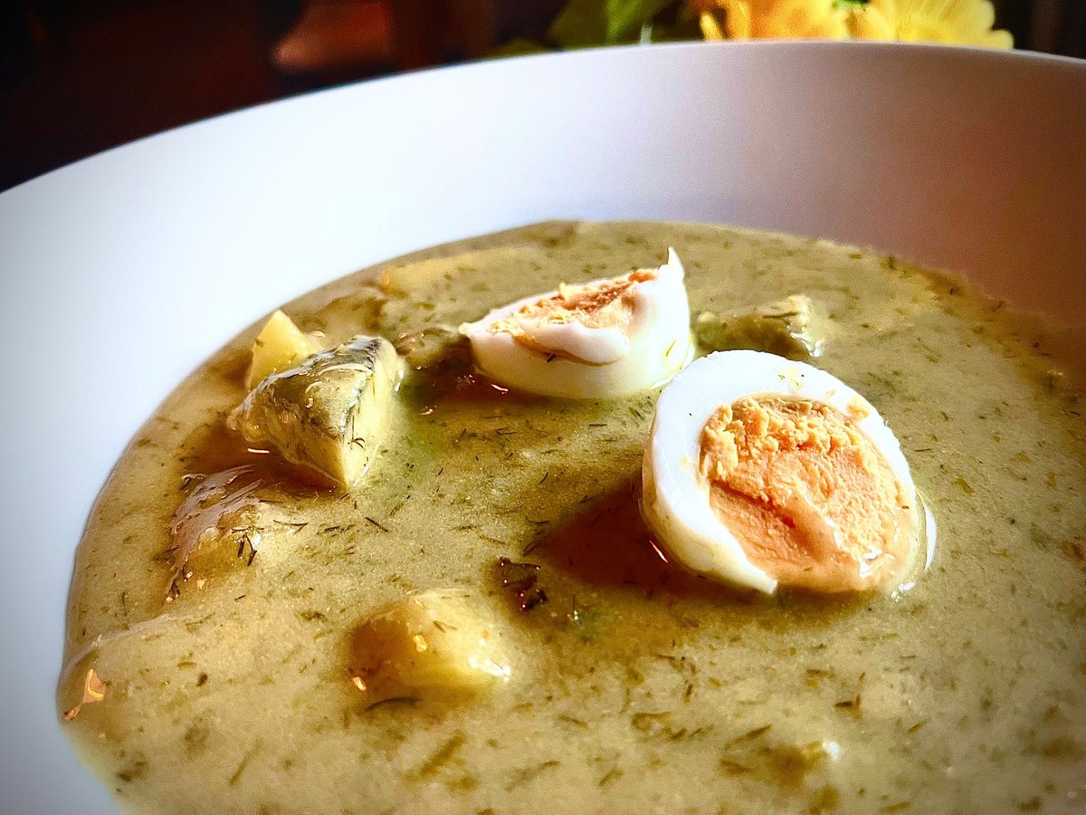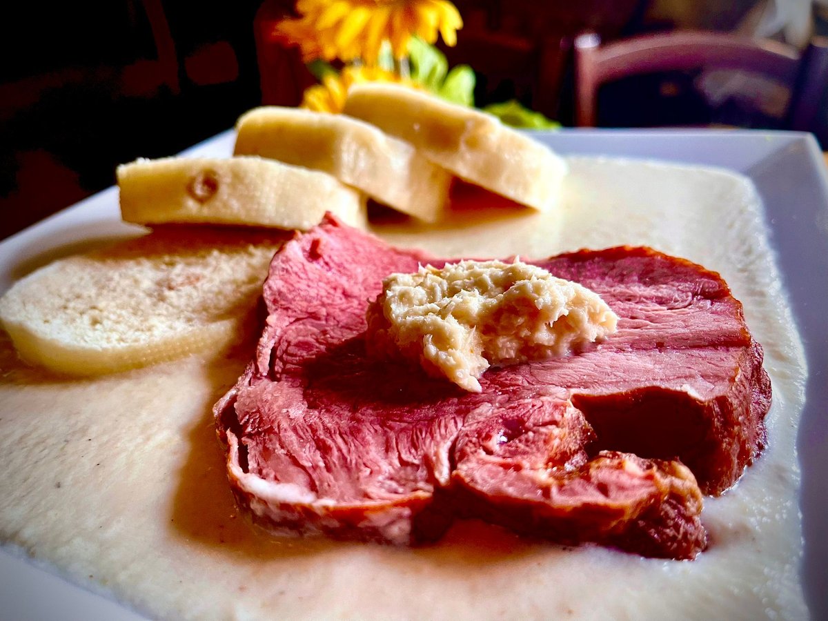 Jemná smetanová křenová omáčka s plátky uzeného masa, podávaná s houskovým knedlíkem. Alergeny: 1 (lepek), 7 (mléko)