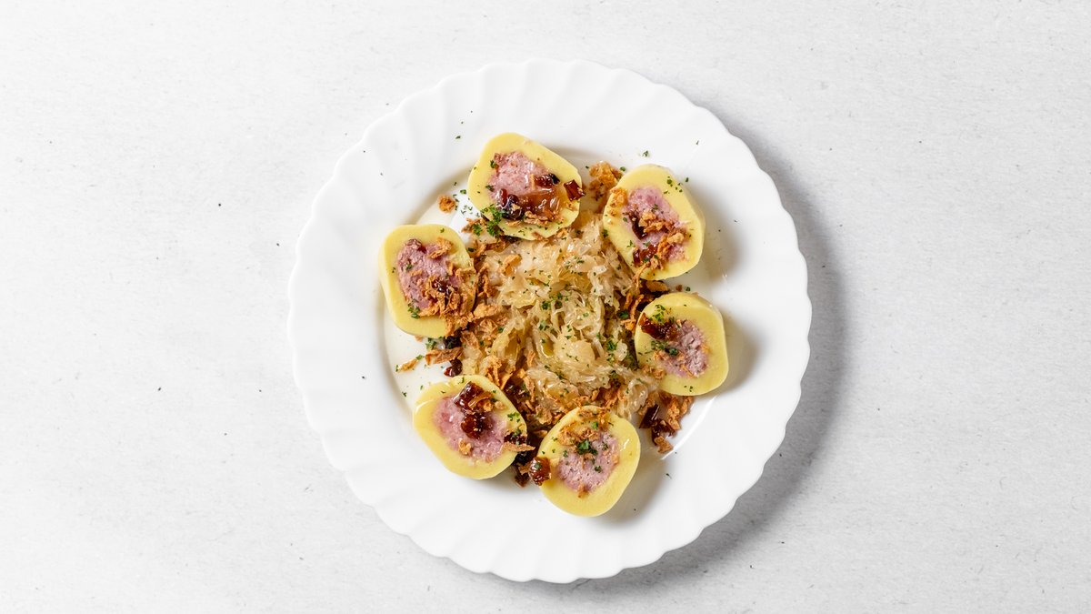 300g Plněné bramborové knedlíky uzeným masem, zelí, cibulka