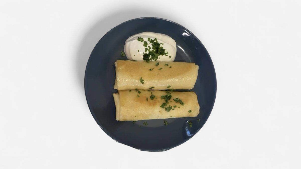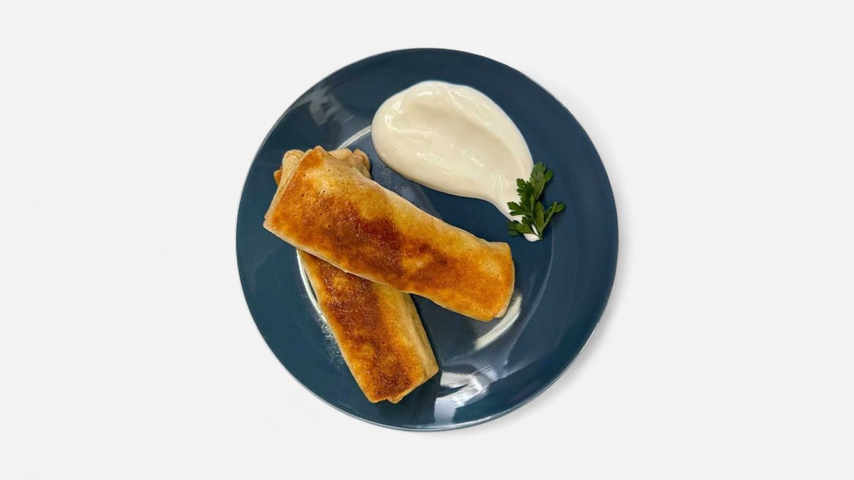2 palačinky plněné vepřovým masem a smaženou cibulkou, podávané se zakysanou smetanou