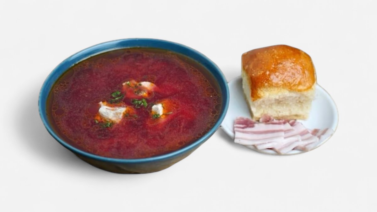 Tradiční ukrajinská polévka v masovém vývaru s červenou řepou, zelím, brambory, rajčaty, mrkví, cibulí a vepřovým masem. Podává se se zakysanou smetanou, bylinkami a pampeškou