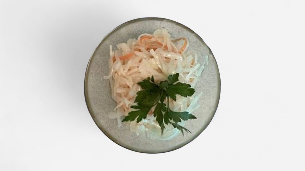 Salát s vařenými bramborami, mrkví, řepou, cibulí, sleďem a majonézou.