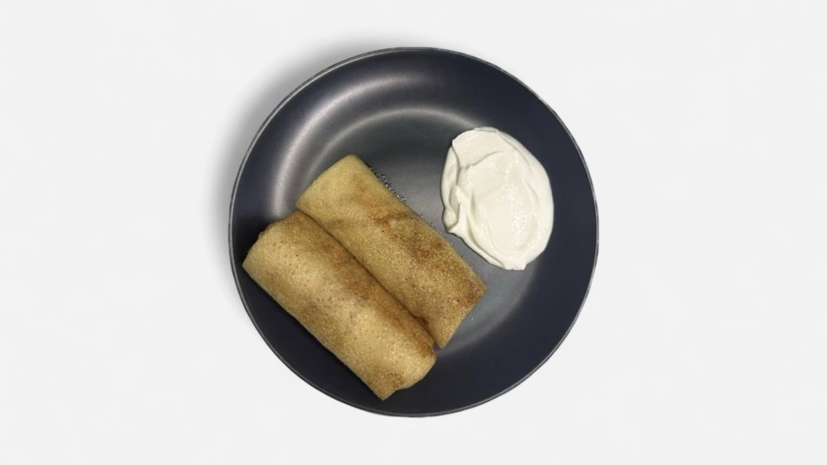2 palačinky plněné tvarohem a rozinkami, podávané se zakysanou smetanou a džemem