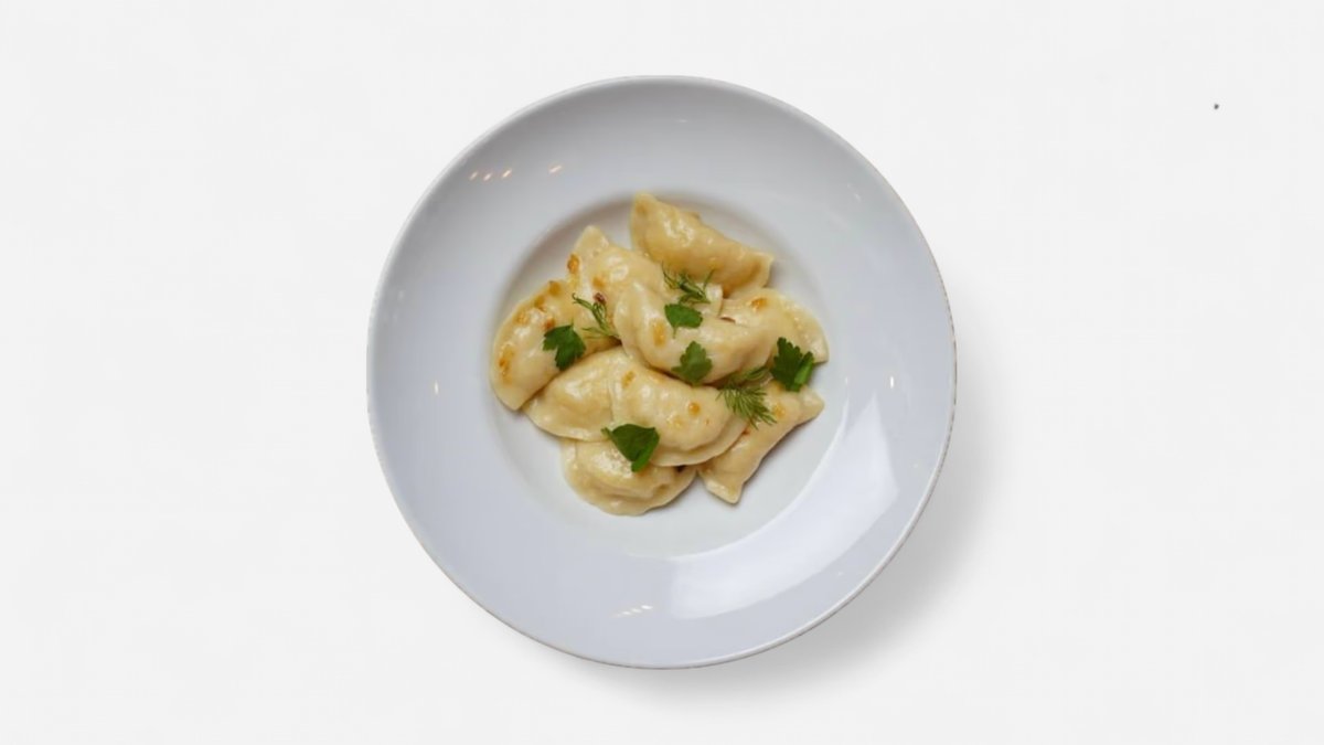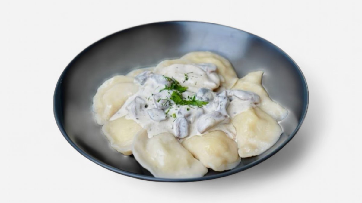 Varenyky z lahodného těsta plněné bramborami a cibulí. Podávají se s houbovou omáčkou a zakysanou smetanou