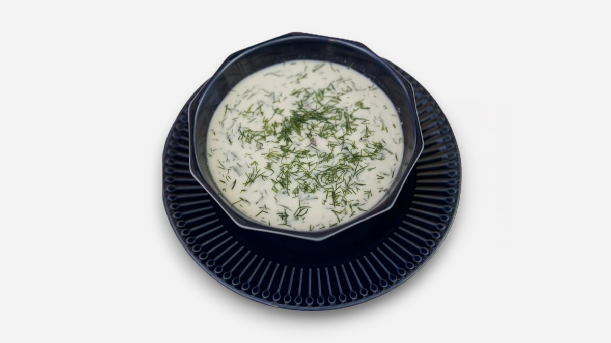 Studená polévka z čerstvých okurek, ředkviček, zelené cibule, bylinek, vařených brambor, vajec a kuřecího masa, ochucená kefírem a hořčicí