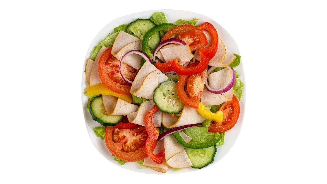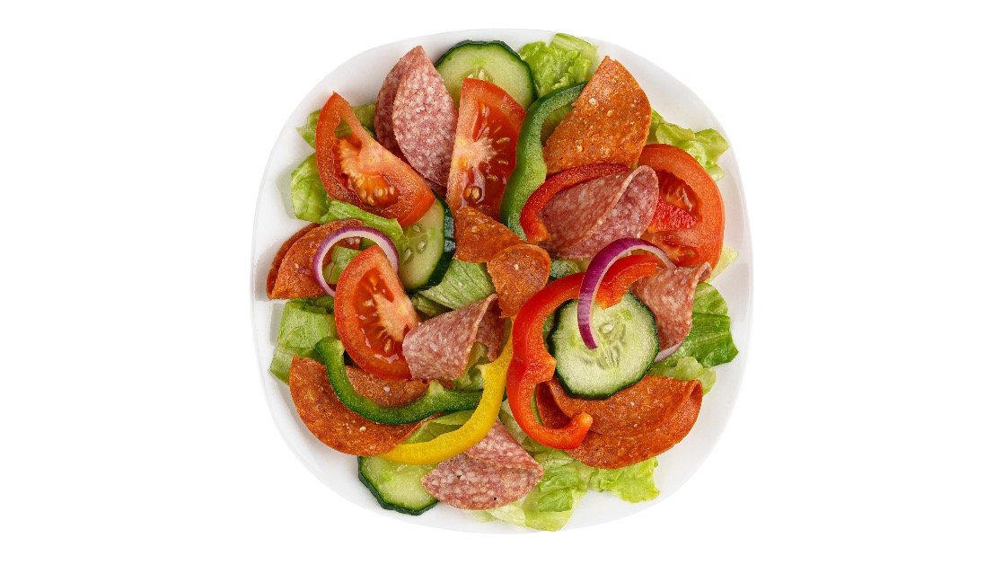 Svěží salát s Italským salámem, plátky sýra, zeleninou a omáčkou.