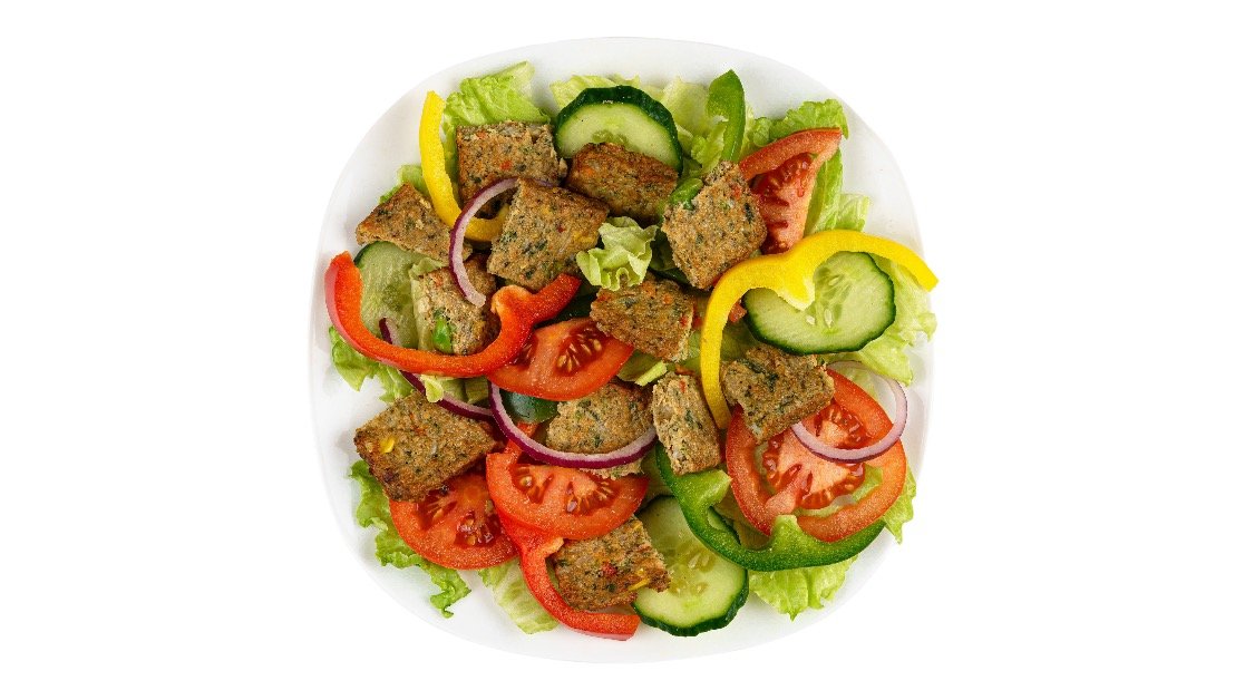 Salát s pikantním veganským plátkem, křupavou zeleninou a omáčkou.