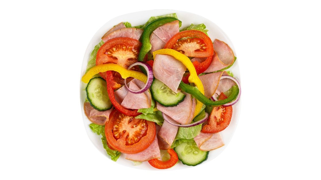 Salát s pikantním italským salámem, šunkou, plátky sýra, zeleninou a omáčkou
