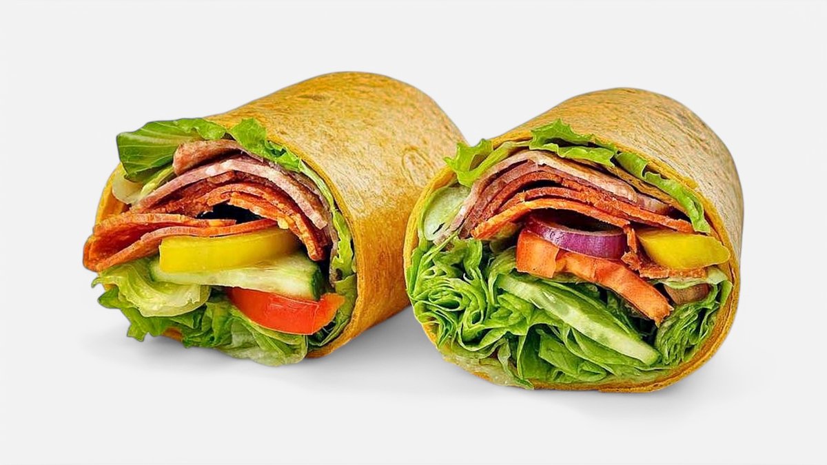 Tortilla plněná pepperoni, salami, šunkou, plátky sýra, zeleninou a omáčkou.