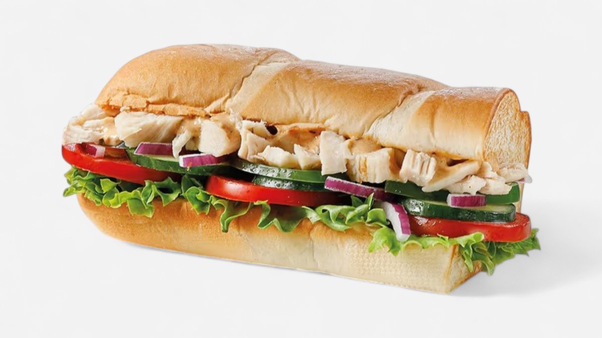 Sendvič s čerstvým grilovaným kuřecím prsíčkem, sýrem, zeleninou a omáčkou podle vašeho výběru.