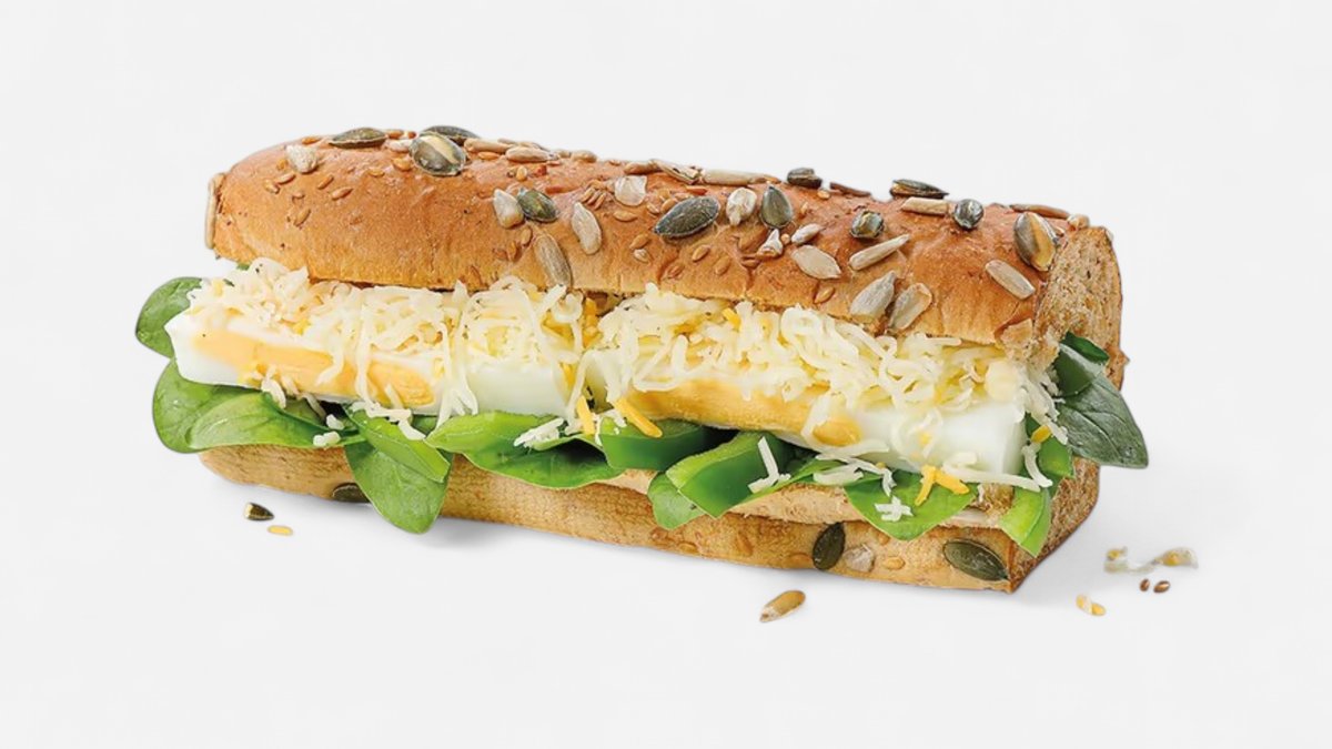 Sendvič plněný sýrem, vajíčkem, zeleninou a omáčkou