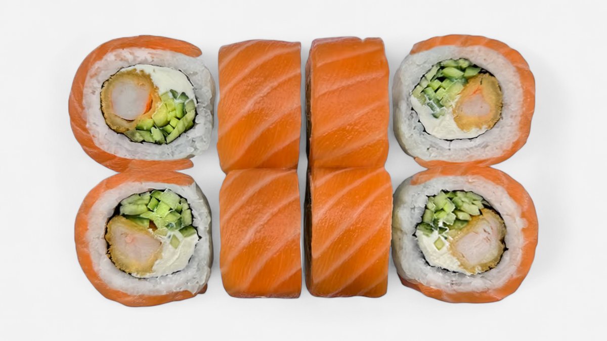 8ks - losos, kreveta tempura, smetanový sýr, okurka, rýže, řasa nori, sójová omáčka, zázvor, wasabi (2,4,7)