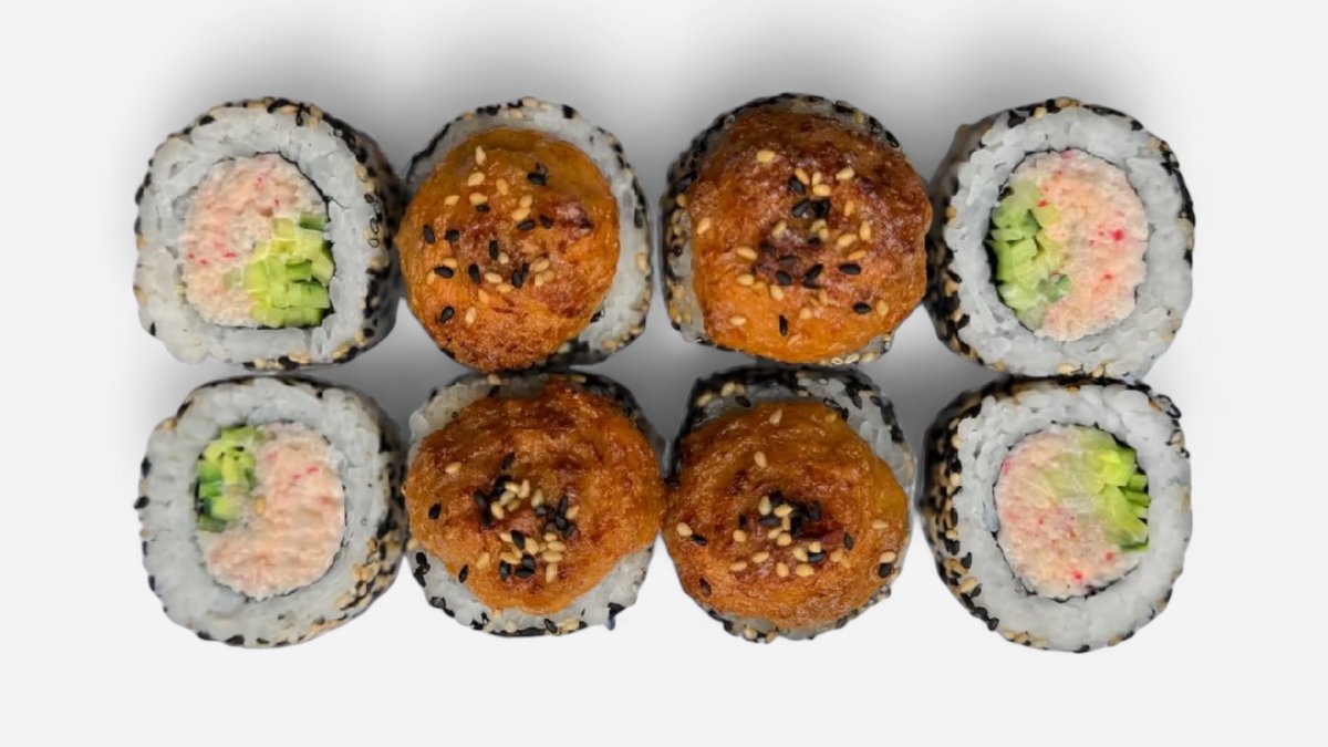 8ks - sake teriyaki mix, krabí mix, okurka, sezam, rýže, řasa nori, sójová omáčka, zázvor, wasabi (3,4,11)