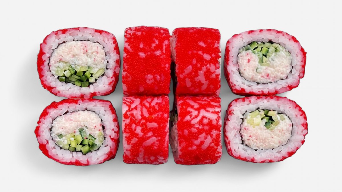 8ks - krabí mix, masago kaviár, okurka, pikantní omačka, rýže, řasa nori, tempurový obal, strouhanka panko, sójová omáčka, zázvor, wasabi (1,3,4)