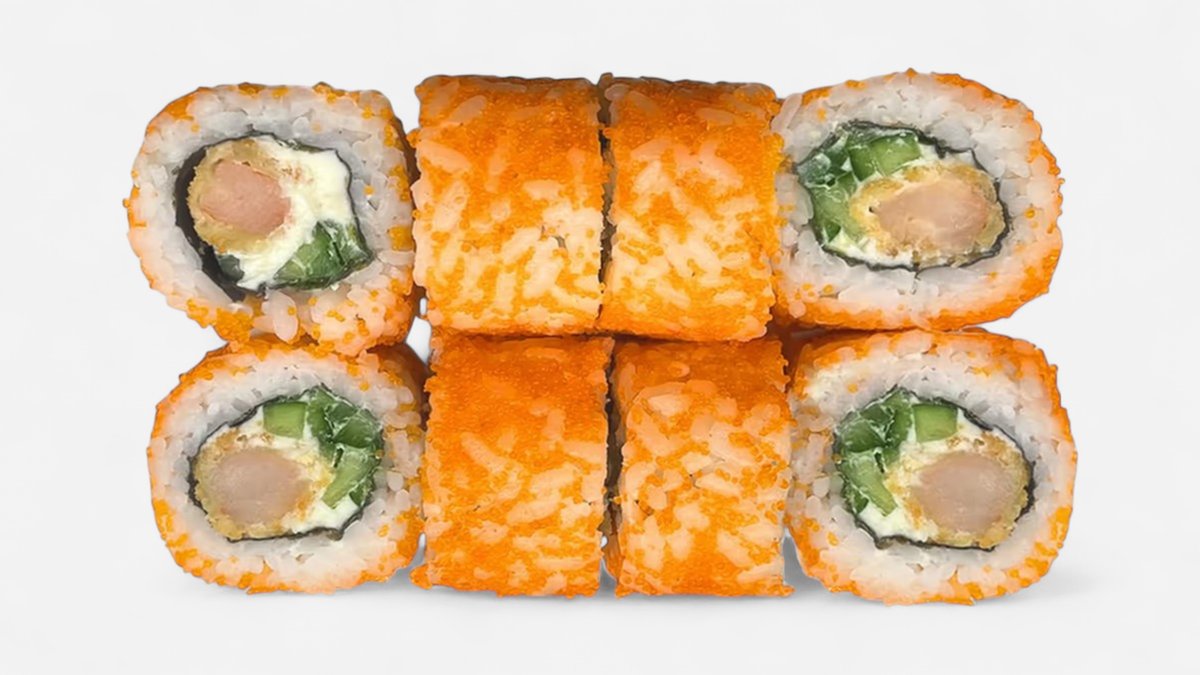 8ks - kreveta tempura, masago kaviár, smetanový sýr, okurka, rýže, řasa nori, sójová omáčka, zázvor, wasabi (2,4,7)