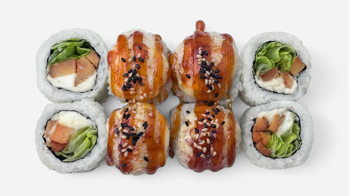 8ks - sake teriyaki mix, kreveta tempura, smetanový sýr, ledový salát, okurka, sezam, rýže, řasa nori, sójová omáčka, zázvor, wasabi (1,2,3,4,7,11)