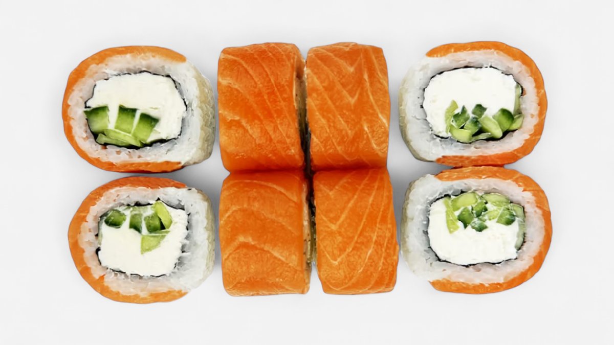 8ks - losos, smetanový sýr, okurka, unagi omačka, rýže, řasa nori, sójová omáčka, zázvor, wasabi (2,4,7)