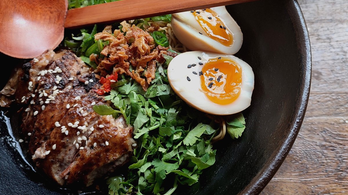 kachní prso, kachní vývar, pšeničné nudle, marinované vejce, koriandr, jarní cibulka, nori, chilli